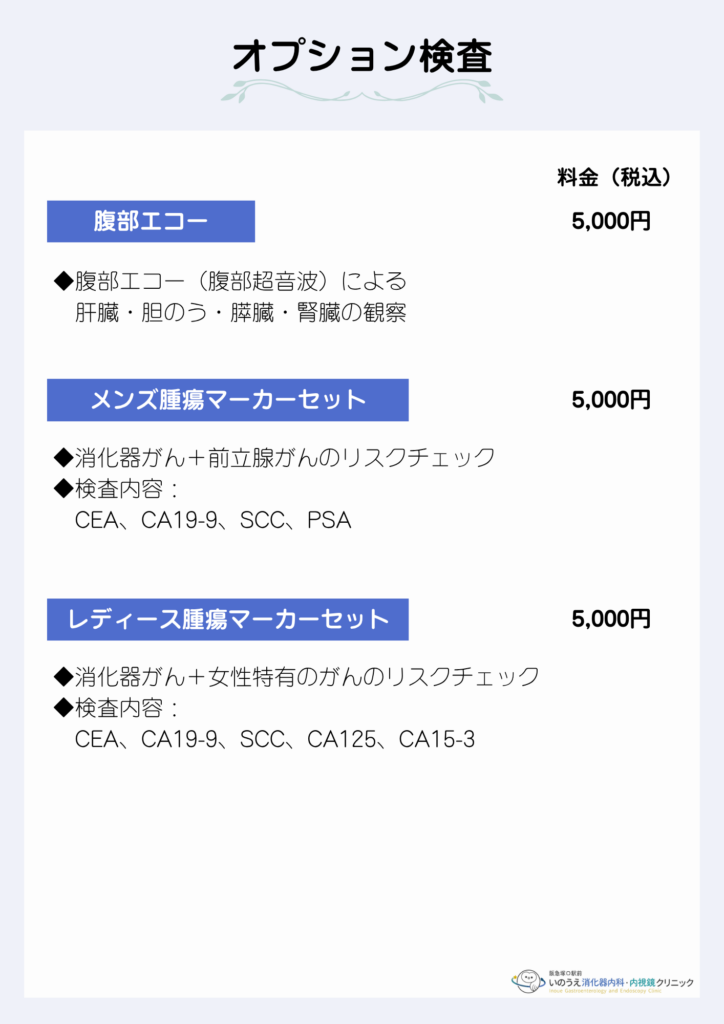 検査内容:胃カメラ検査(鎮静剤使用)、総合健診(※)、便潜血検査(2日法)、胸腹部単純CT