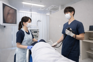 当院では麻酔(鎮静剤)を使用した内視鏡検査を行っており、患者さまが落ち着いた状態で検査が進むため、スタッフにとってもバタバタしすぎず、安心して働ける環境です。
